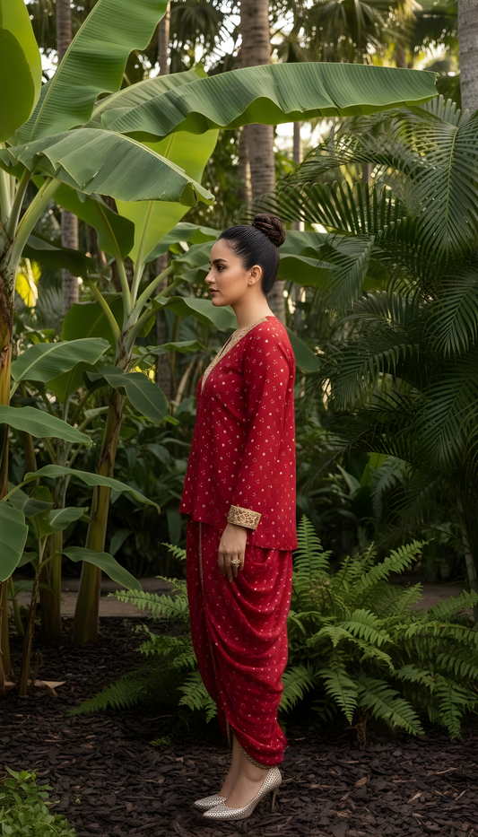MAROON MIRROR-WORK DHOTI SET WITH PRINTED V-NECK TOP