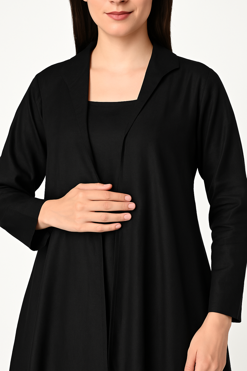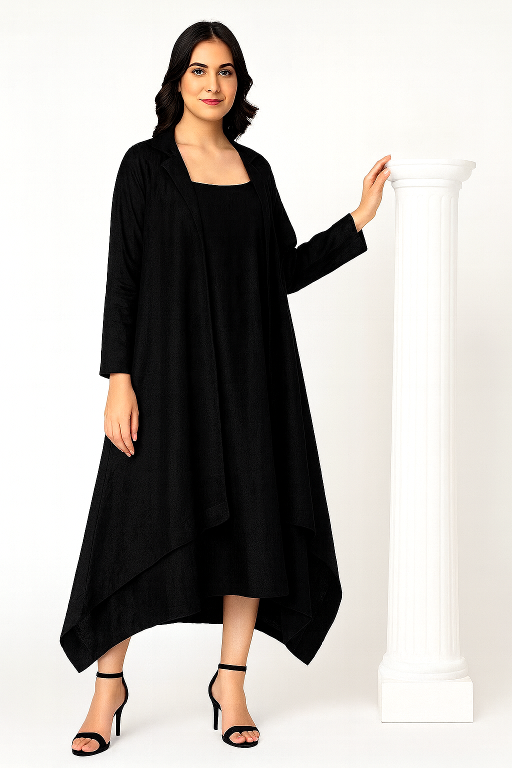 ELEGANT BLACK ASYMMETRIC LINEN DRESS WITH LONG OVERLAY
