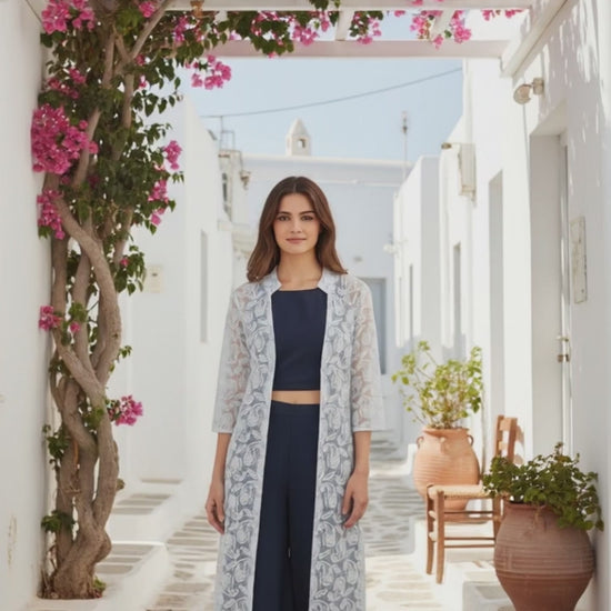 A stunning fusion of modern inner and traditional embroidery, this set includes a deep navy blue crop top and pallazo paired with a soft, pastel Chikankari jacket. The inner dress features a flattering cowl drape, enhanced by a back zipper for a structured fit. The lightweight Chikankari jacket adds an elegant touch with intricate embroidery, making it ideal for festive gatherings, office chic, or casual brunches.