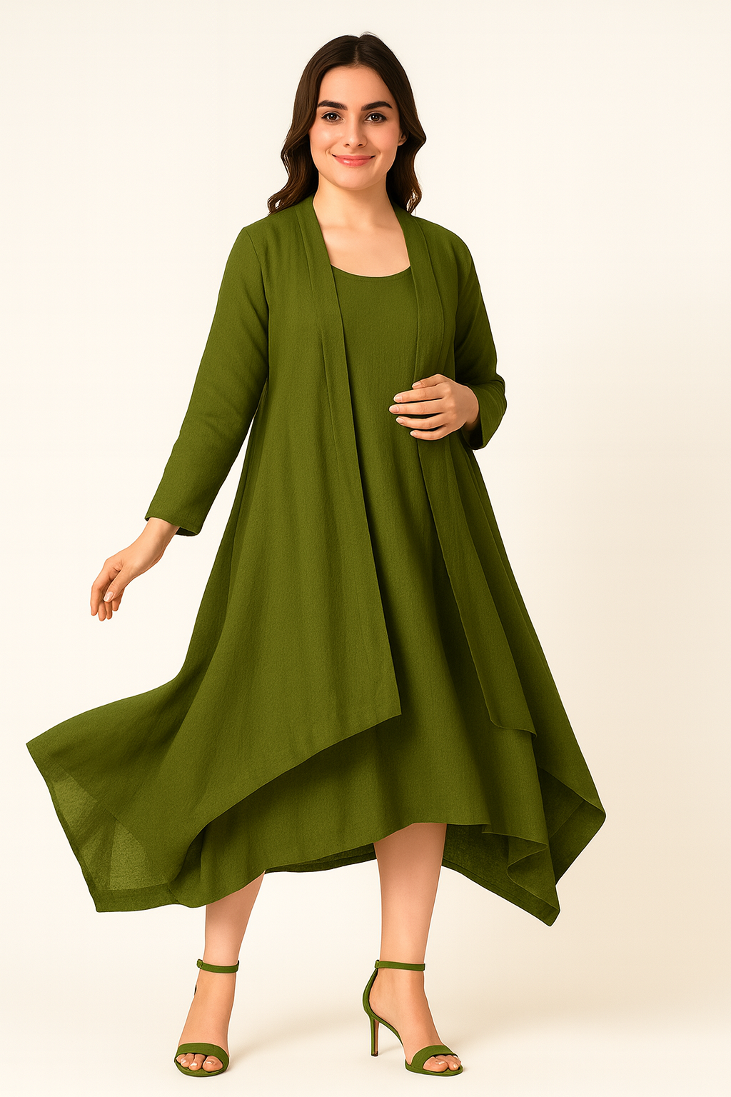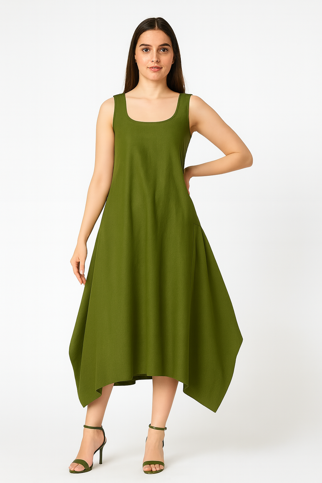 Elevate your style with our Olive Green Sleeveless Dress, featuring a flattering asymmetrical hem and a breathable linen-look fabric. Perfect for both casual chic and special occasions, this versatile piece pairs comfort with sophistication. Designed to drape beautifully on all body types, it’s your go-to for effortless elegance.